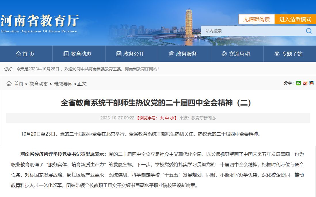 近日,河南省教育厅刊发了我校党委书记贺望琢关于党的二十届四中全会精神的热议评论。校党委书记贺望琢表示:党的二十届四中全会立足社会主义现代化全局,以长远视野擘画了中国未来五年发展蓝图,也为职业教育明确了“服务实体、培育新质生产力”的发展坐标。下一步,学校党委将扎实学习贯彻全会精神,把握时代方位与使...