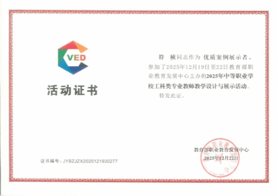 本次活动由教育部职业教育发展中心主办,是全国中职教育领域的权威教学交流平台,聚焦“三教”改革与立德树人根本任务,吸引各地优秀教师同台竞技。两位教师的参赛案例贴合中职教学实际、育人成效突出,经微课展示、现场说课、专家答辩等多环节比拼,赢得评委一致认可。荣誉的取得,离不开教师个人的深耕钻研,更得益于学校“研训赛一体化”的教师培养体系。我校始终聚焦教学改革,通过常态化教研、专项培训、专家指导等举措,为教师成长赋能,营造了浓厚的教研氛围。