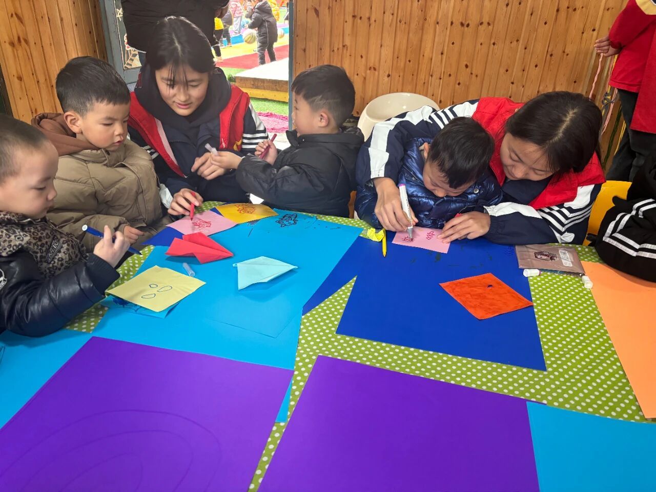 课堂上,志愿者活用专业知识:折纸课上,孩子们用画笔勾勒乡村风貌;音乐律动课上,手偶操以身体声势传递节奏魅力;趣味活动点燃探索欲,情景模拟筑牢安全防线。课后,志愿者们化身“陪伴使者”,陪孩子读绘本、玩益智游戏,以温暖填补留守儿童情感空缺。