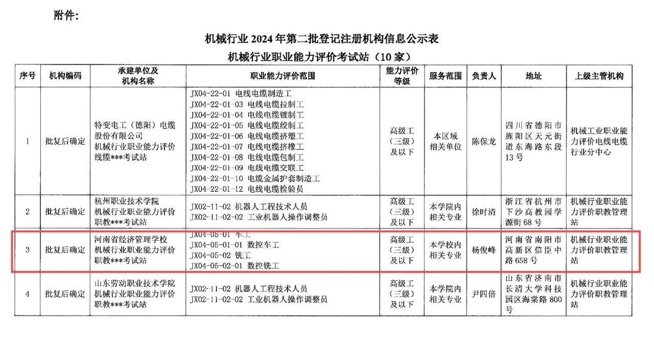 依据《机械工业人才评价工作实施办法》《机械工业人才评价机构管理规程》《机械工业人才评价机构申报及注册管理办法》的要求,中国机械工业联合会机械工业人才评价中心对2024年第二批登记注册机构的申报材料进行了严格审核,我校顺利通过评审,成为车工、数控车工、铣工、数控铣工四个工种的职业能力评价考试站。