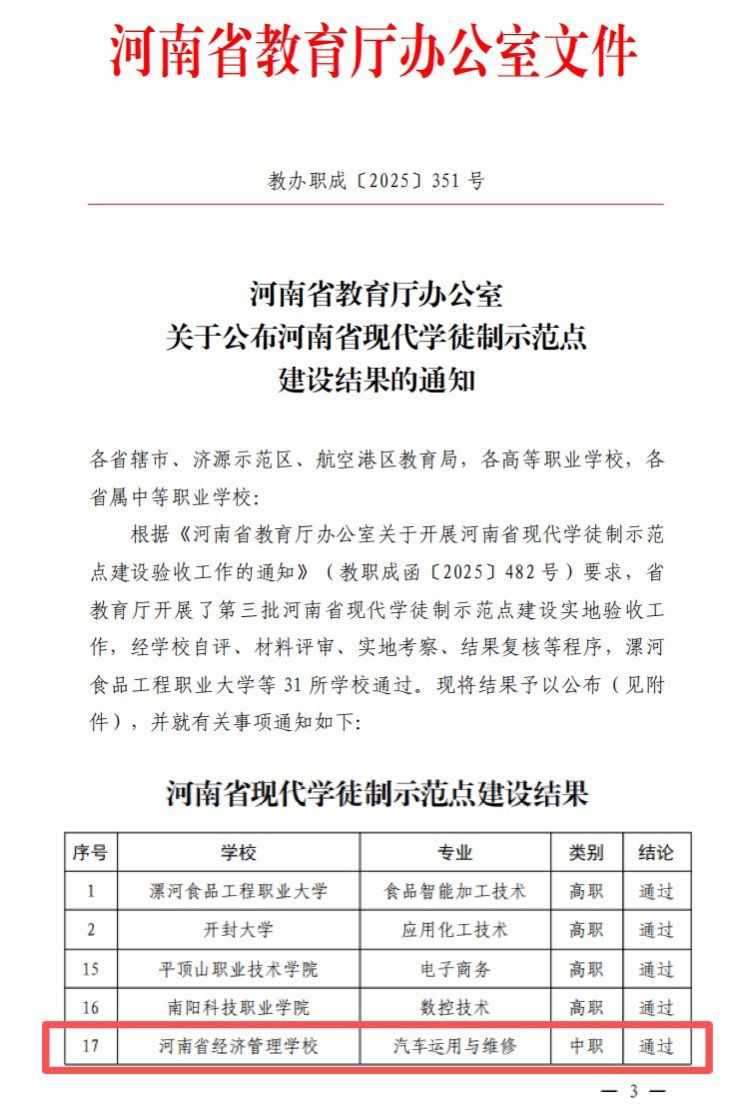 近日,省教育厅公布了河南省第三批现代学徒制示范点建设验收结果,我校汽车运用与维修专业省级现代学徒制示范点项目顺利通过验收,标志着学校在产教融合、技能人才培养领域斩获权威认证,育人成效获专家组高度认可。
