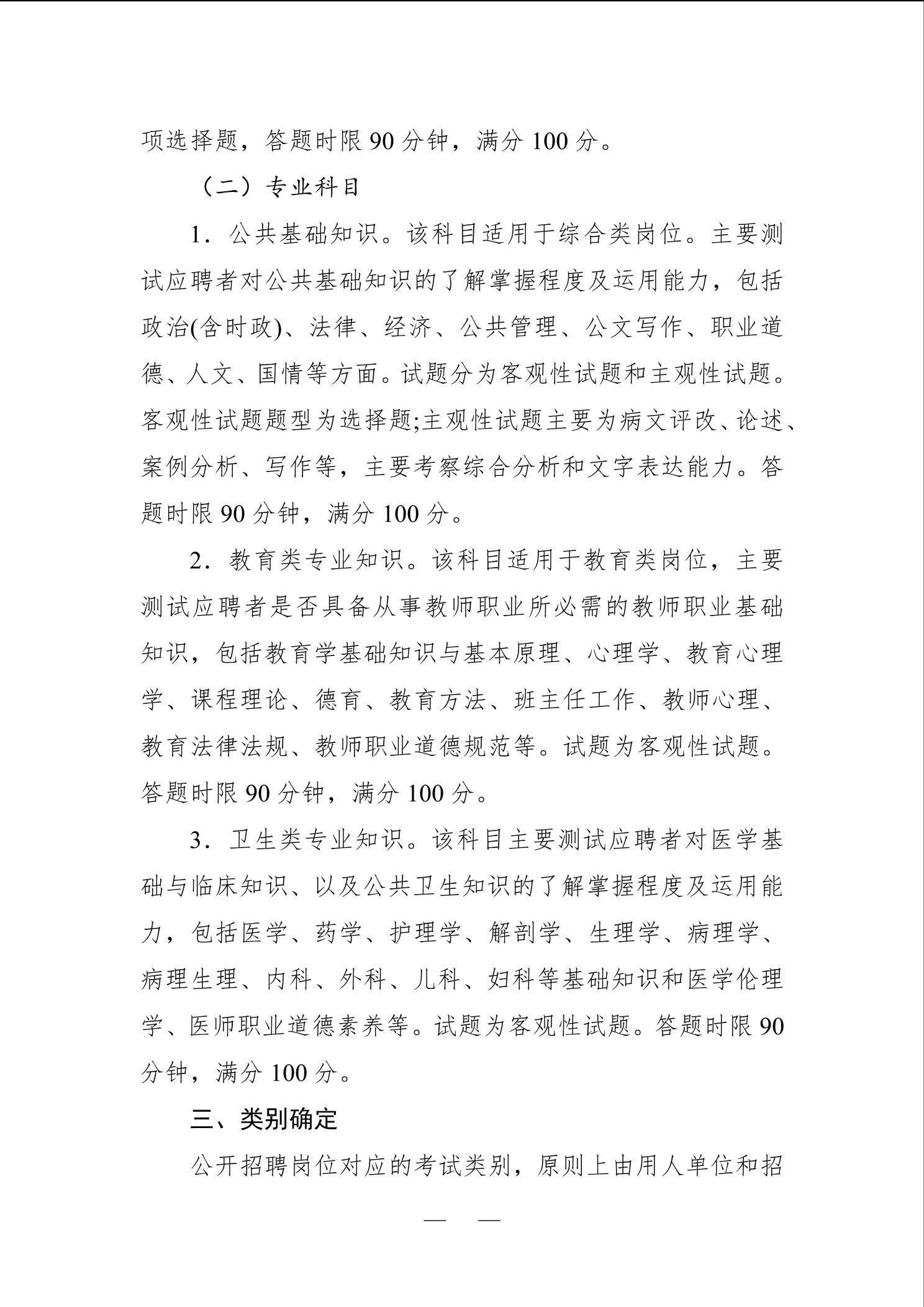 1. 笔试科目。本次招聘考试分为综合类、教育类、卫生类三个类别。