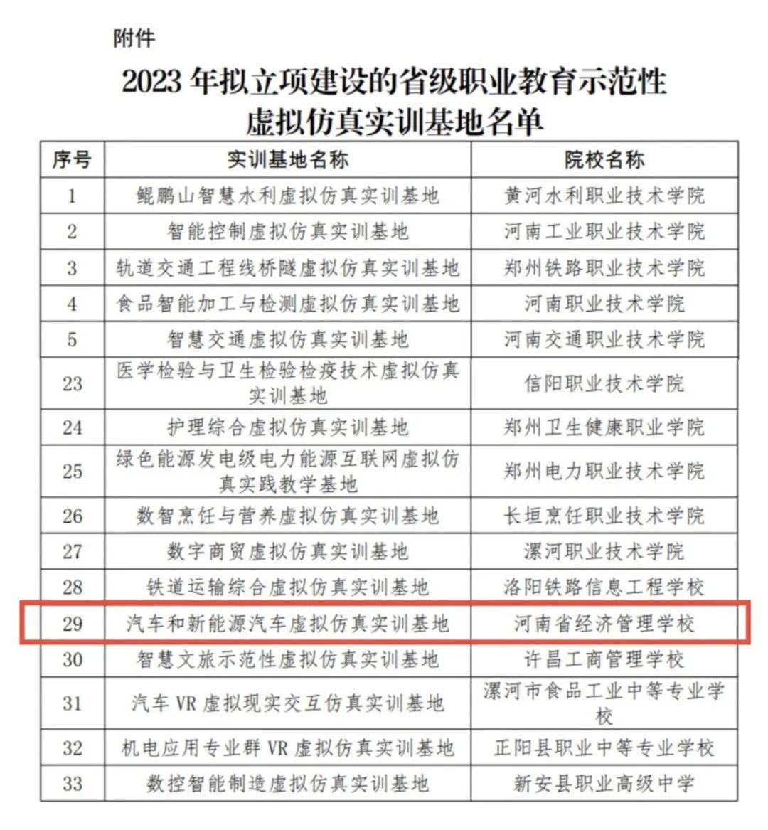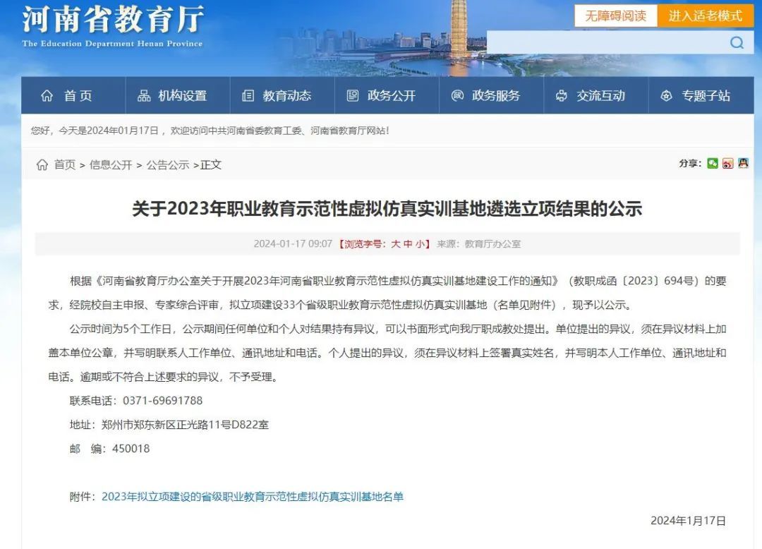 1月17日,河南省教育厅发布了《关于2023年职业教育示范性虚拟仿真实训基地遴选立项结果的公示》,我校汽车和新能源汽车虚拟仿真实训基地项目成功入选。