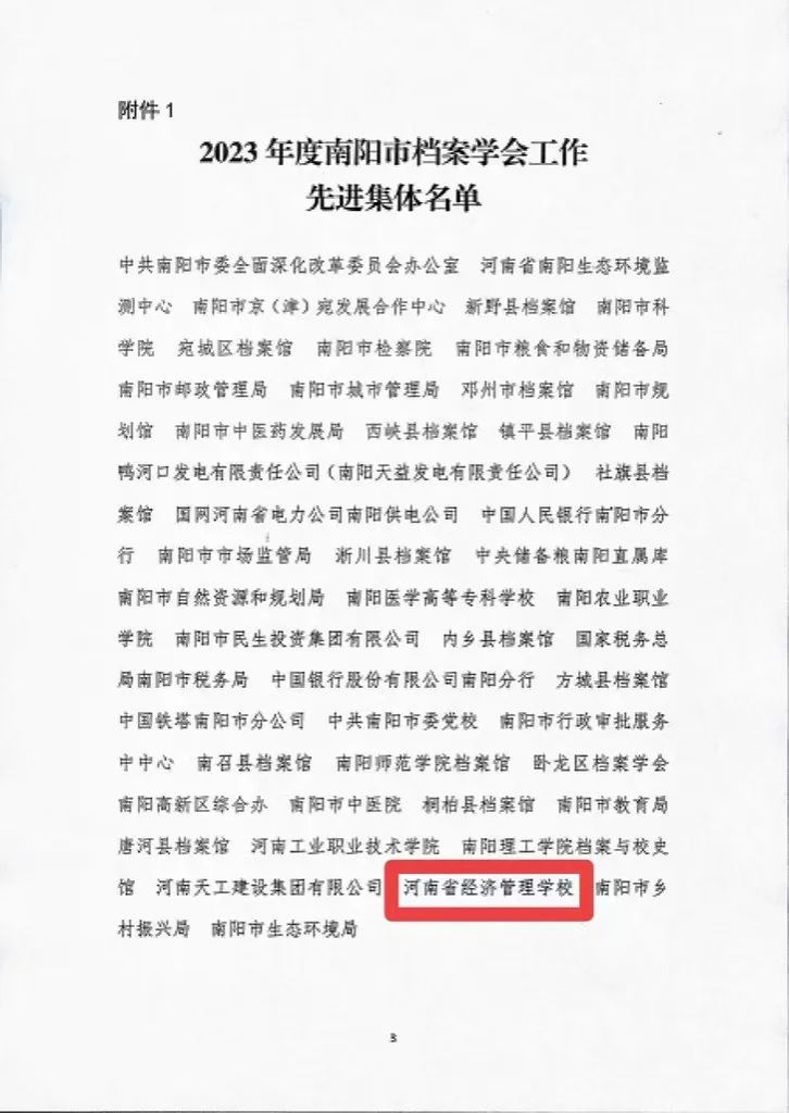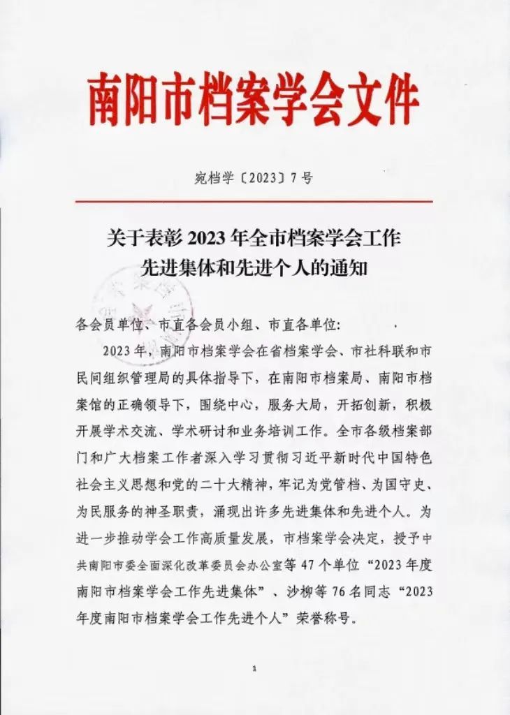 近日,南阳市档案学会发文公布了2023年度全市档案工作先进集体和先进个人名单,我校荣获“档案学会先进集体”,李公昕获得“档案学会先进个人”荣誉称号,这是我校首次获得南阳市档案工作先进集体和先进个人。