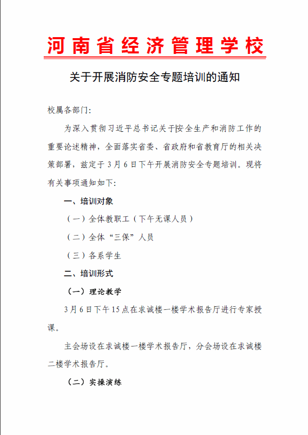 为深入贯彻习近平总书记关于安全生产和消防工作的重要论述精神,全面落实省委、省政府和省教育厅的相关决策部署,兹定于3月6日下午开展消防安全专题培训。现将有关事项通知如下:
