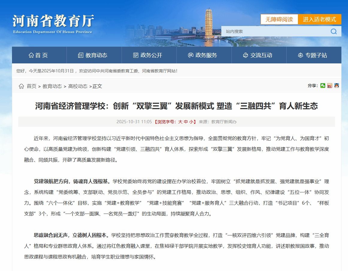 10月31日,河南省教育厅官方网站刊发我校创新发展案例,集中展示学校以“双擎三翼”发展新模式、“三融四共”育人新生态推动学校高质量发展的显著成效。作为河南省首批中职“双高工程”建设单位,学校始终坚持以习近平新时代中国特色社会主义思想为指导,全面贯彻党的教育方针,牢记“为党育人、为国育才”初心使命,以...