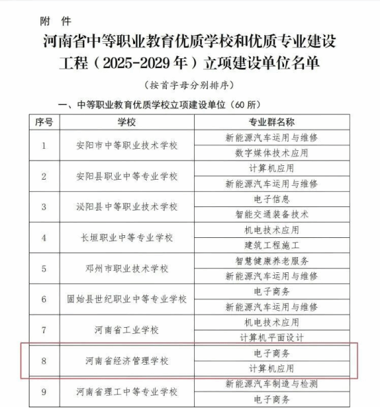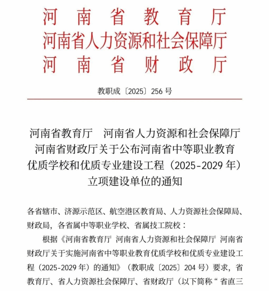 近日,河南省教育厅、河南省人力资源和社会保障厅、河南省财政厅联合下发《关于公布河南省中等职业教育优质学校和优质专业建设工程(2025-2029年)立项建设单位的通知》(教职成〔2025〕256号),正式公布了“河南省中等职业教育优质学校和优质专业建设工程(2025-2029年)”立项建设单位名单。我校凭借扎实的办学基础、鲜明的专业特色和突出的育人成果,成功入选“中等职业教育优质学校立项建设单位”,标志着上级部门对学校办学水平和综合实力的认可和我校在职业教育高质量发展道路上迈出了新的坚实一步。