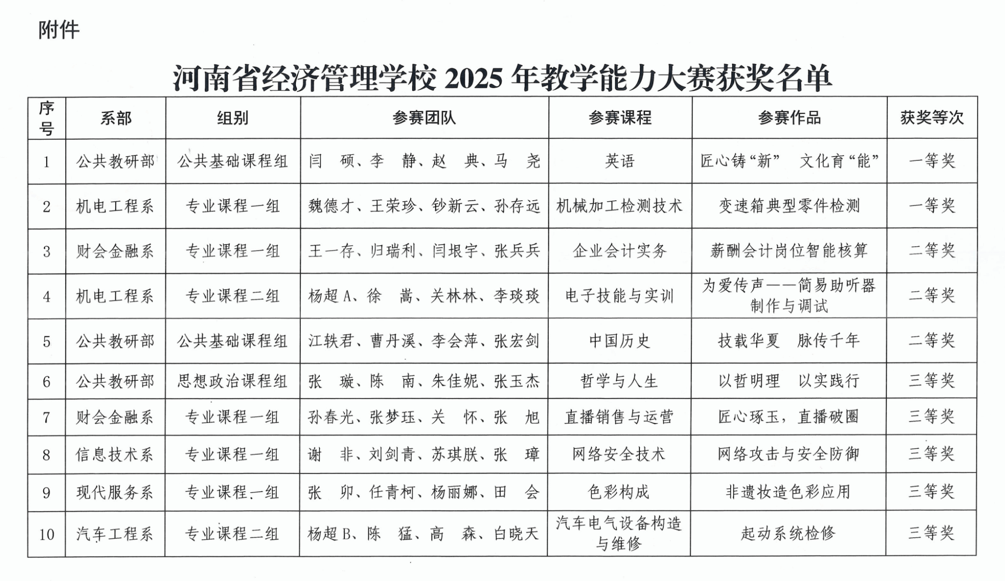 为深入贯彻《教育强国建设规划纲要(2024—2035年)》《中共中央国务院关于弘扬教育家精神加强新时代高素质专业化教师队伍建设的意见》等文件要求,学校于近日组织开展了2025年度校级教学能力大赛,经过文字材料评审和现场展示两个环节,共评出一等奖2个,二等奖3个,三等奖5个。