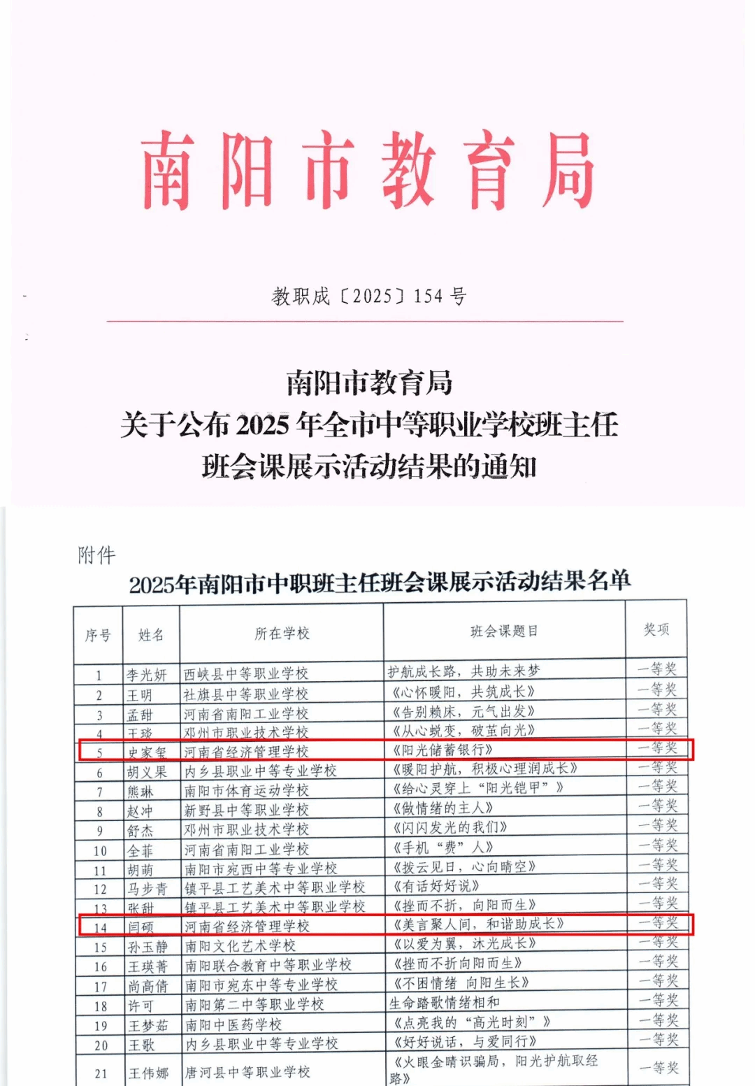 近日,南阳市教育局公布2025年全市中等职业学校班主任班会课展示活动评选结果,我校闫硕、史家玺两位班主任凭借精巧的教学设计、生动的课堂呈现和深刻的育人内涵,双双斩获一等奖,充分彰显了我校班主任队伍过硬的专业素养和创新育人能力。