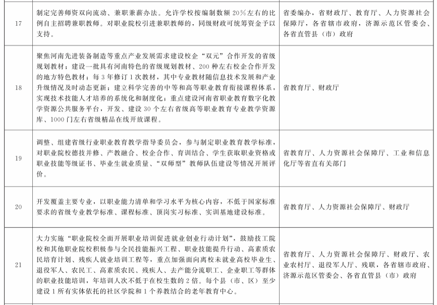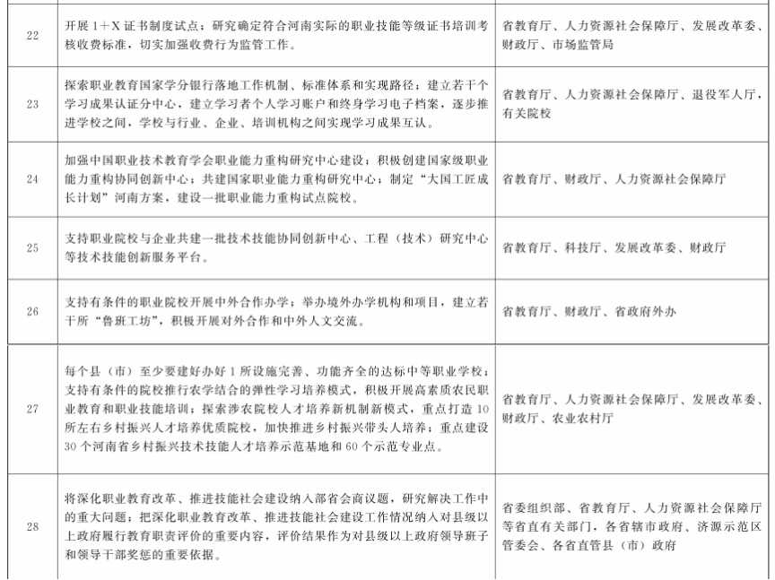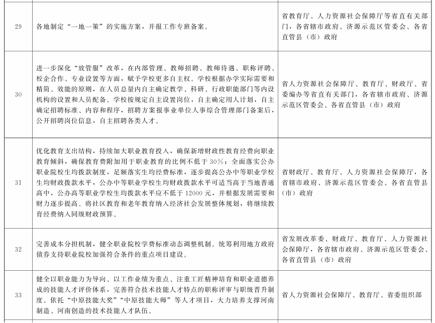 (二十五)建立部省协调推进体制机制。建立由教育部和河南省政府主要负责同志共同担任组长,教育部分管副部长和河南省分管副省长担任副组长,教育部相关司局和河南省政府有关部门负责同志为成员的领导小组,负责统筹协调推进工作;组建由教育部职成教司司长和河南省政府分管副秘书长、河南省教育厅厅长牵头的工作专班,负责具体推进工作。将深化职业教育改革、推进技能社会建设纳入部省会商议题,研究解决工作中的重大问题。河南各级政府和有关部门要切实落实发展职业教育的职责,河南省政府把深化职业教育改革、推进技能社会建设工作情况纳入对县级以上政府履行教育职责评价的重要内容,评价结果作为对县级以上政府领导班子和领导干部奖惩的重要依据。按照国家有关规定,对职业教育先进单位和先进个人给予表彰奖励。各地要制定“一地一策”的实施方案,并报工作专班备案。