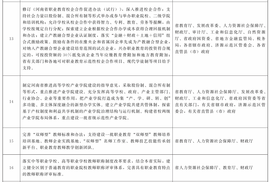 (十一)完善校企合作激励政策。修订《河南省职业教育校企合作促进办法(试行)》,深入推进校企合作。发挥企业重要办学主体作用,支持社会力量以股份制、混合所有制等形式举办或参与举办职业院校、二级学院和培训机构。校企合作中,学校可从中获得智力、专利、教育、劳务等报酬,由学校按规定自行分配。探索建立企业根据校企合作办学成本获得合理回报机制,调动企业参与校企合作的积极性。建立产教融合型企业认证制度,落实“金融+财政+土地+信用”组合式激励政策。鼓励有条件的在豫央企和省属国企率先成为产教融合型企业,对纳入产教融合型企业建设培育范围的试点企业,兴办职业教育的投资符合规定的,可按投资额的30%抵免该企业当年应缴教育费附加和地方教育附加。河南省有关部门和各地可对职业教育示范性校企合作项目、现代学徒制等项目给予支持。