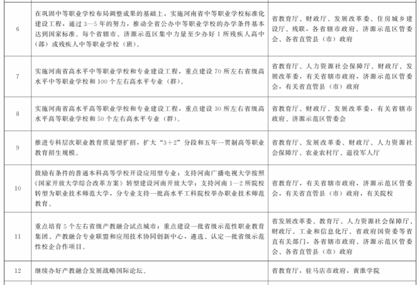 (七)巩固中等职业教育的基础地位。保持高中阶段教育招生职普比大体相当,使绝大多数城乡新增劳动力接受高中阶段教育。在巩固中等职业学校布局调整成果的基础上,实施河南省中等职业学校标准化建设工程,通过3—5年的努力,推动全省公办中等职业学校的办学条件基本达到国家标准。实施河南省高水平中等职业学校和专业建设工程,重点建设70所左右省级高水平中等职业学校和100个左右高水平专业(群)。每个省辖市、济源示范区集中力量至少办好1所残疾人高中(部)或残疾人中等职业学校(班)。支持中等职业学校多样化发展,探索举办以艺术、体育等为核心培养内容的特色职业学校。