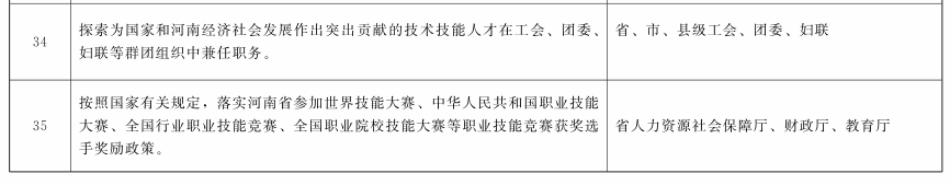 (二十八)提高技术技能人才待遇。探索推进社会用人制度改革,克服“五唯”顽疾。健全以职业能力为导向、以工作业绩为重点、注重工匠精神培育和职业道德养成的技能人才评价体系,完善符合技术技能人才特点的职称评审与职级晋升制度。依托“中原技能大奖”“中原技能大师”等人才项目,大力培养支撑河南制造、河南创造的技术技能人才队伍。鼓励企业对高技能人才实行技术创新成果入股、岗位分红和股权期权等激励方式。探索为国家和河南经济社会发展作出突出贡献的技术技能人才在各级工会、团委、妇联等群团组织中兼任职务。按照国家有关规定,落实河南省参加世界技能大赛、中华人民共和国职业技能大赛、全国行业职业技能竞赛、全国职业院校技能大赛等职业技能竞赛获奖选手奖励政策。
