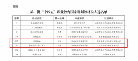 在国家职业教育规划教材遴选中,我校《机械基础》与《基础会计(第二版)》成功入选。其中,李晗主编的《机械基础》聚焦机械类专业教学痛点,以“够用、实用、好用”为原则,采用模块化教学方式,融入13个真实工业场景,已在省内外20余所中职校推广;李新主编的《基础会计(第二版)》紧跟会计数字化趋势,融合理论、软件操作与实务案例,突出理实一体教学,实施模块化教学,配备可听、可视的教学微视频、实操视频、教学动画和拓展阅读等数字化学习资源,成为河南中职会计教学标杆。