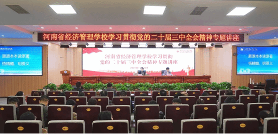 为深入理解、全面把握党的二十届三中全会精神,将全会提出的新部署、新要求转化为推动学校高质量发展的强大动力,11月12日,我校在求诚楼学术报告厅举办学习贯彻党的二十届三中全会精神专题讲座,邀请中共南阳市委党校副校长张利平教授作精神解读,班子成员及全体教职工参加了讲座,讲座由党委书记贺望琢主持。