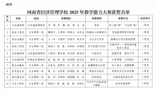 为深入贯彻《教育强国建设规划纲要(2024—2035年)》《中共中央国务院关于弘扬教育家精神加强新时代高素质专业化教师队伍建设的意见》等文件要求,学校于近日组织开展了2025年度校级教学能力大赛,经过文字材料评审和现场展示两个环节,共评出一等奖2个,二等奖3个,三等奖5个。