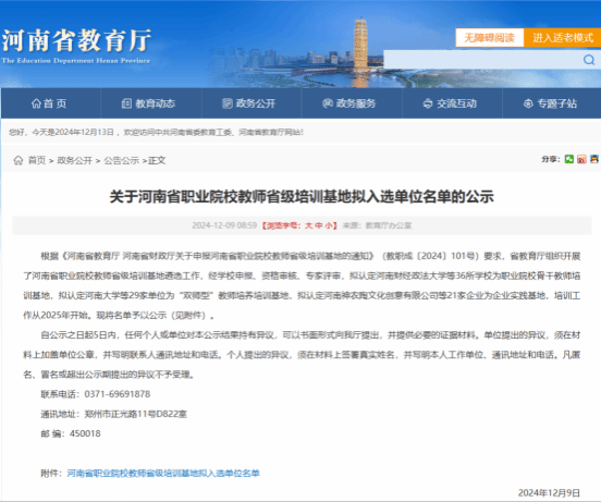 根据《河南省教育厅 河南省财政厅关于申报河南省职业院校教师省级培训基地的通知》(教职成〔2024〕101号)要求,省教育厅组织开展了河南省职业院校教师省级培训基地遴选工作,我校经过申报、资格审核、专家评审等环节,成功入选河南省职业院校“双师型”教师培养培训基地,全省共有29所学校入选。
