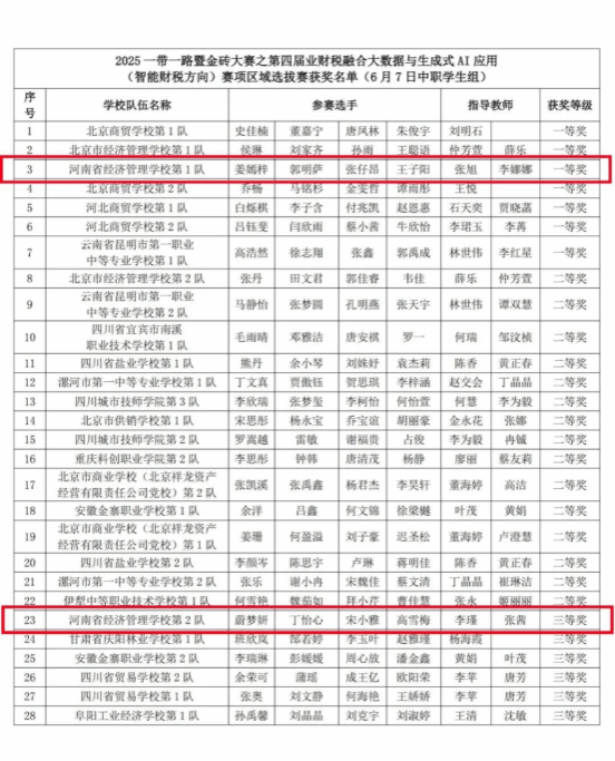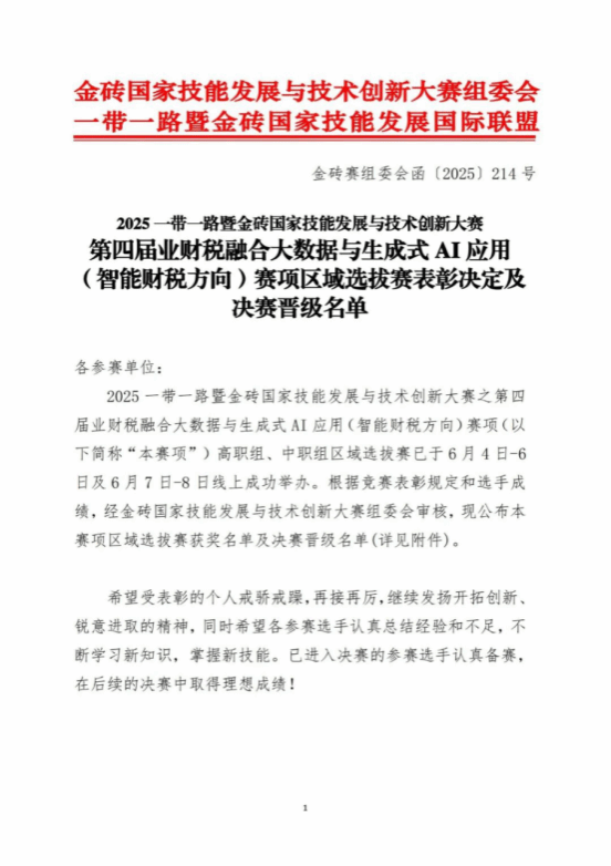 2025年“一带一路”暨金砖国家技能发展与技术创新大赛之第四届业财税融合大数据与生成式AI 应用(智能财税方向)赛项高职组、中职组区域选拔赛已于6月4日-6日及6月7日-8日在线上成功举办。我校财会金融系派出的两支代表队分别荣获一等奖和三等奖,其中张旭、李娜娜老师指导的团队成功晋级全国总决赛。