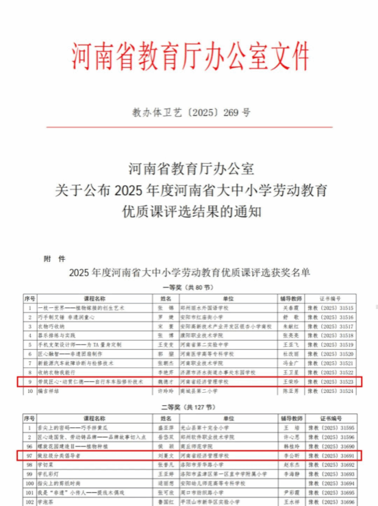 近日,河南省教育厅公布了2025年度河南省大中小学劳动教育优质课评选结果,我校教师魏德才荣获一等奖,刘蔓文荣获二等奖,充分彰显了我校创新劳动教育教学改革方面的积极成效。